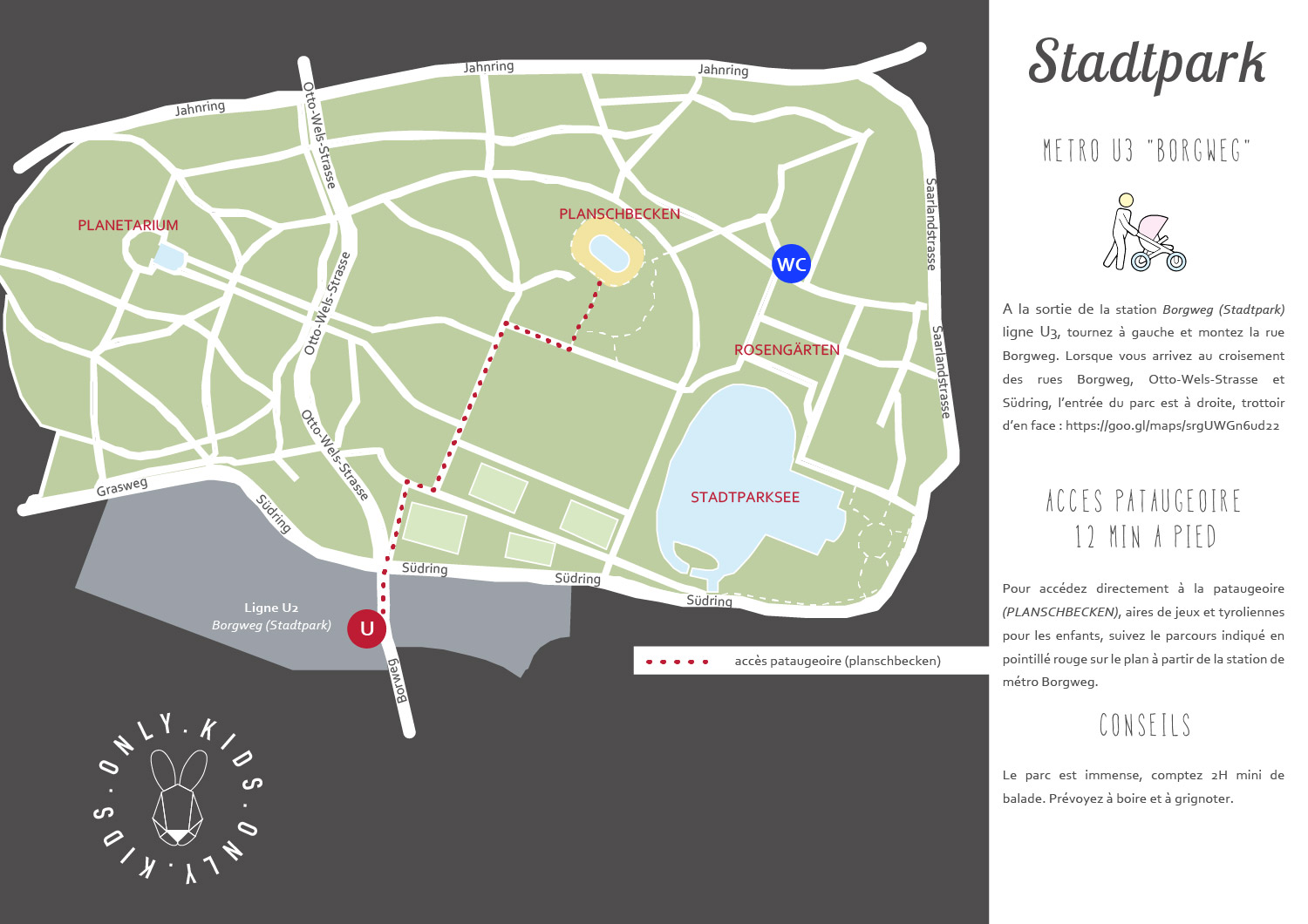 Les enfants en redemandent ! Comme Stadtpark est très grand à parcourir, Onlykidstravel vous conseille d’aller directement à « Planschbecken » : pataugeoire en français. Il s’agit d’une plage avec un grand bassin qui convient aux tout-petits (10 cm d’eau). Les mamans bien organisées emporteront les maillots de bain, crème solaire, Crocs, pique-nique et eau. NO PANIC, sur place il y a de quoi se restaurer (frites, glaces, boissons). Voici comment y aller (facile en poussette) depuis l’arrêt du métro « Borgweg (Stadtpark) » Ligne U-3.
